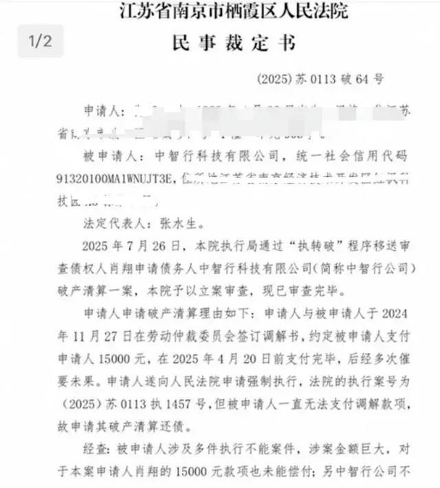 裁定书显示,中智行无力支付1.5万元的劳动仲裁款,被申请破产清算还债,进入“执转破”程序。
