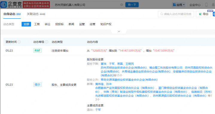 企查查APP显示,近日,苏州灵猴机器人有限公司发生工商变更,新增蔚来资本旗下合肥蔚来产业发展股权投资合伙企业(有限合伙)、国君创投关联企业上海临港国泰君安科技前沿产业私募基金合伙企业(有限合伙)、厦门雅恒创业投资基金合伙企业(有限合伙)等为股东,同时,注册资本由1.26亿人民币增至约1.41亿人民币。